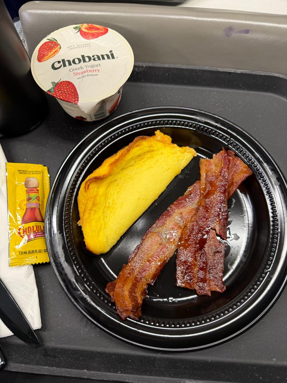 Sec War sat up front, using a different, more photogenic set of steps to board the plane than us in the press. Ours were slick, icy, on the other side of the plane, like Upstairs/Downstairs Pentagon jumbo jet edition. We were served a breakfast of a cheese omelette, bacon, a packet of Cholula and a yogurt. It was one of the better meals we got.