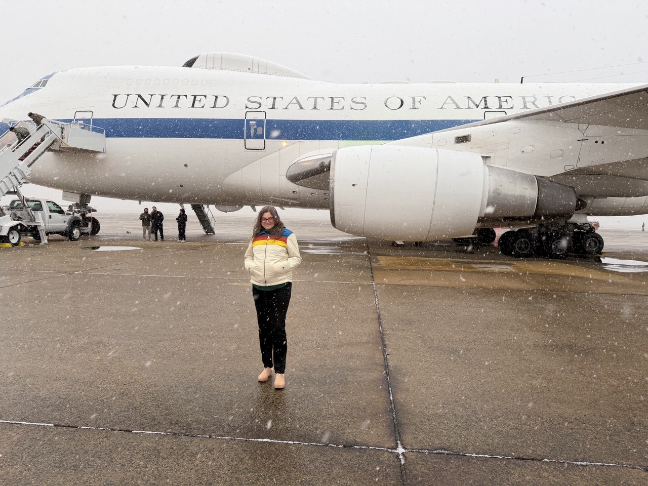Joint Base Andrews is its own city, not that I could see much of it in the blustery darkness. Our bags were sniffed. Our sleepy morning selves were briefed by military and the military adjacent who are used to this kind of private, taxpayer-funded travel. They handed out a double-sided trifold agenda packed with a to-the-minute itinerary. Then we grabbed a bus to head down the tarmac to the jumbo jet with the big United States of America stenciled on the side, the Doomsday Plane, and waited under the wing to watch the Sec War board the plane.