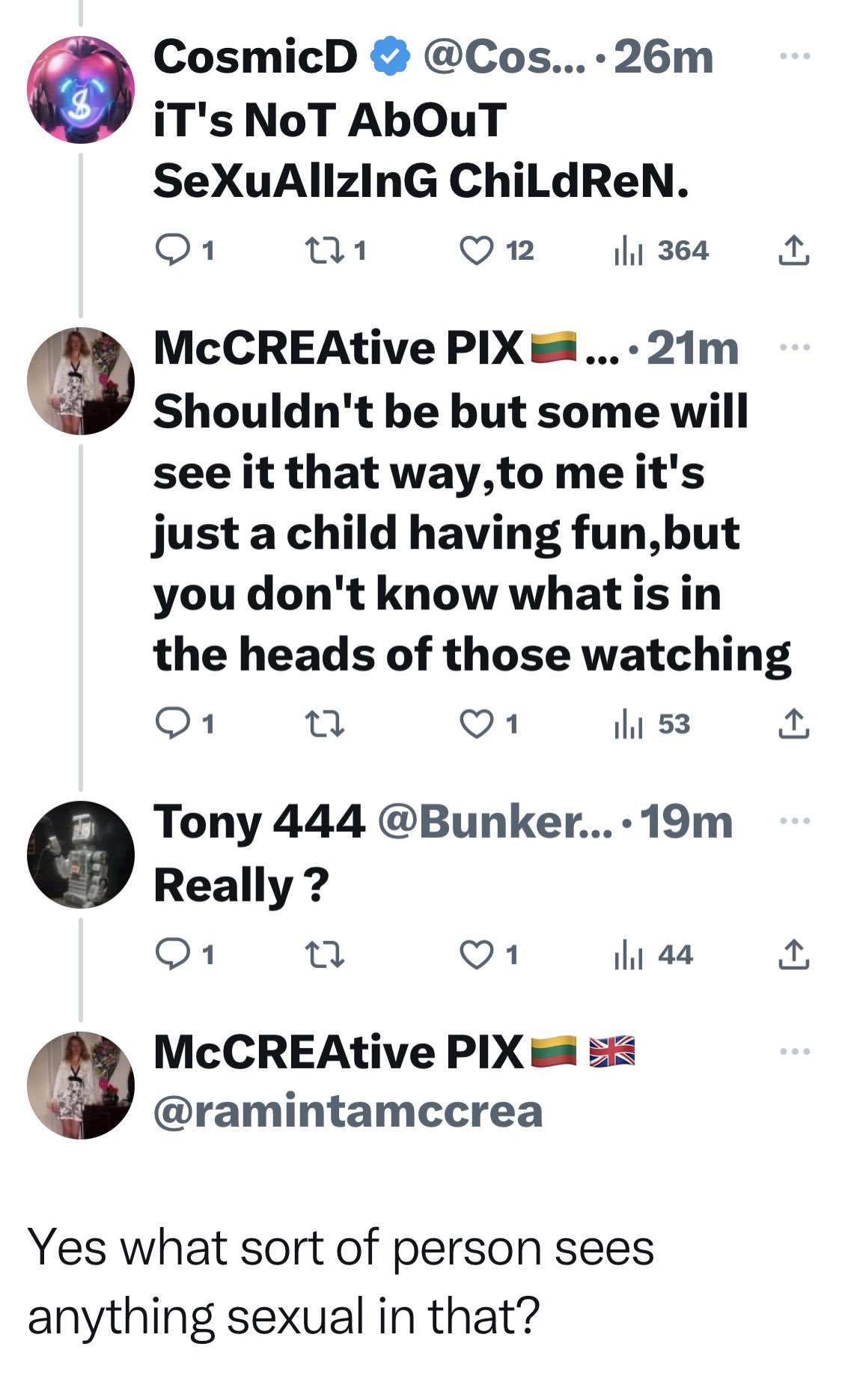 To which McCREAtive PIX responded: "Yes what kind of person sees anything sexual in that?"