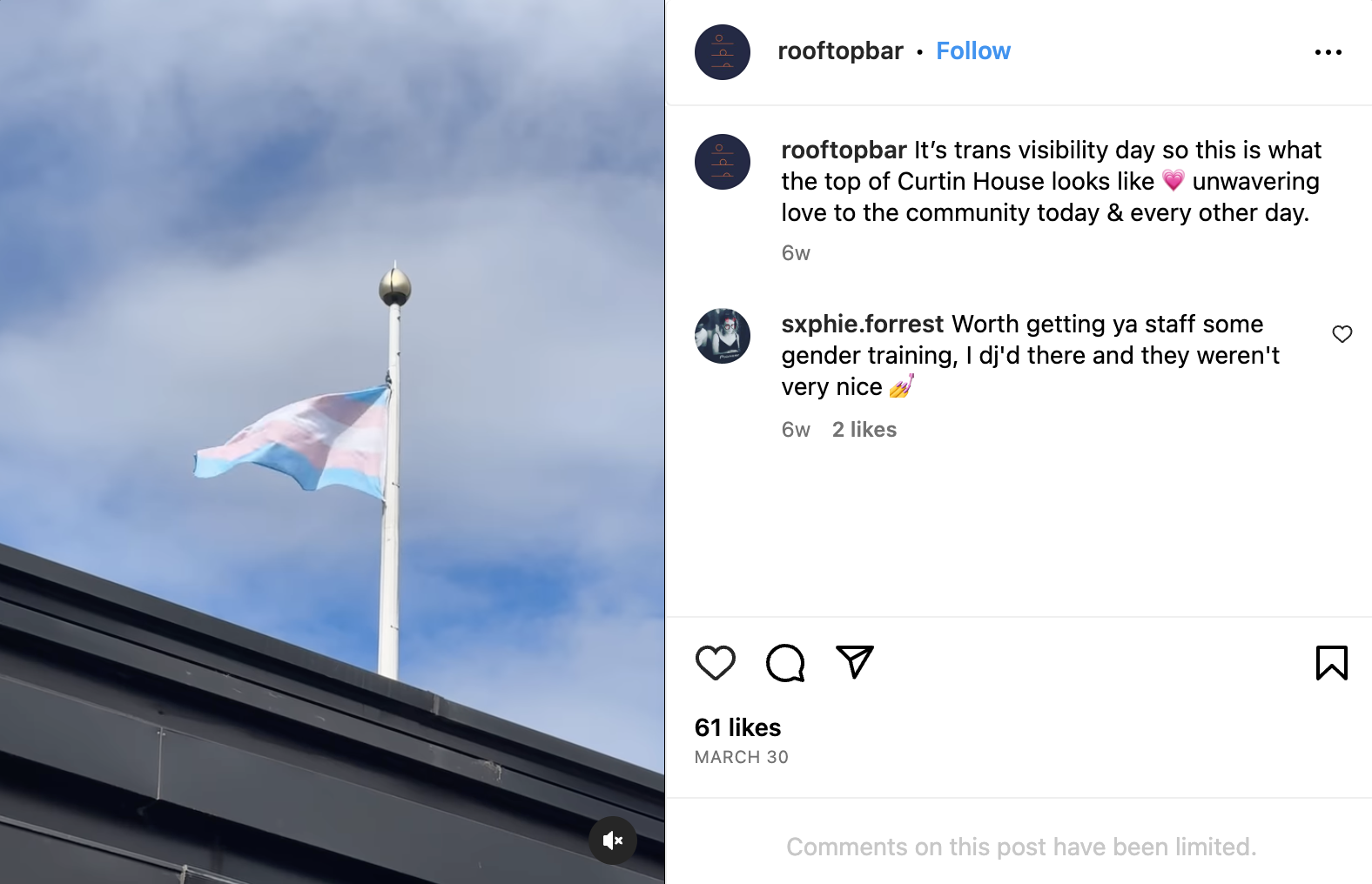 The bar also apparently had a trans flag hanging from the oustide of their establishment. On the Rooftop's Instagram page, they posted: "It's trans visibility day so this is what the top of Curtain House looks like, unwavering love to the community today & every other day."