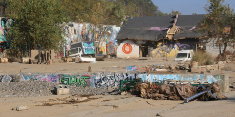 My second day was spent around the Asheville city area looking for FEMA. I wanted to see their operation and maybe dispel some of the rumors. First, I went down to the river. Along it, I saw the devastation firsthand. First responders and search and rescue teams searched the area. There were cars stuck in the mud; Some flipped over. The remains of PVC pipes from a manufacturing plant were scattered down the river. I went to the River Arts District, a spot I visited in 2021. The coffee shop I once bought coffee in was falling into a hole. The cafe where I had lunch had collapsed. Buildings that once had murals painted on them were gone. Other buildings barely stood, with just the frame holding them up. There I ran into people cleaning up the debris. A man told me they had been getting support from FEMA to clean up the area. This was the first positive that I heard about the organization helping, though they were not on site for me to confirm they were helping.