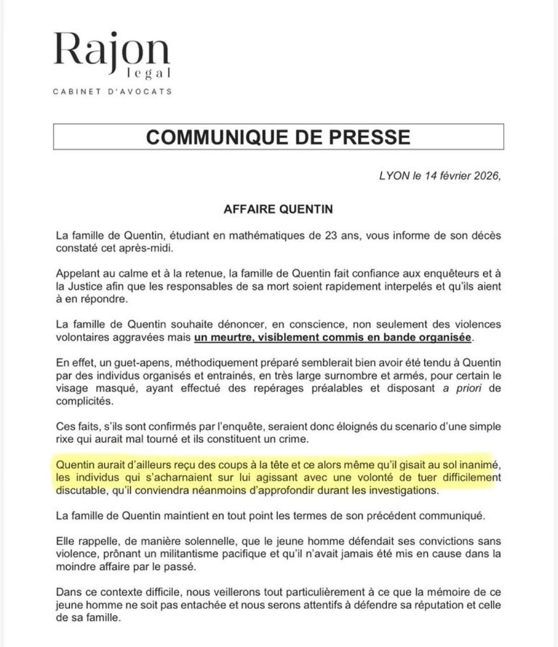 At the hospital, Quentin was placed in an induced coma after suffering multiple brain lesions. He subsequently died from his injuries. Quentin's family said in a statement, translated from French: "Quentin reportedly received blows to the head even while lying motionless on the ground, the individuals who attacked him acting with an undeniable intent to kill, which will nevertheless need to be further investigated."