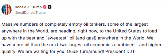 Trump said on Truth Social, "Massive numbers of completely empty oil tankers, some of the largest anywhere in the World, are heading, right now, to the United States to load up with the best and 'sweetest' oil (and gas!) anywhere in the World. We have more oil than the next two largest oil economies combined - and higher quality. We are waiting for you. Quick turnaround!"